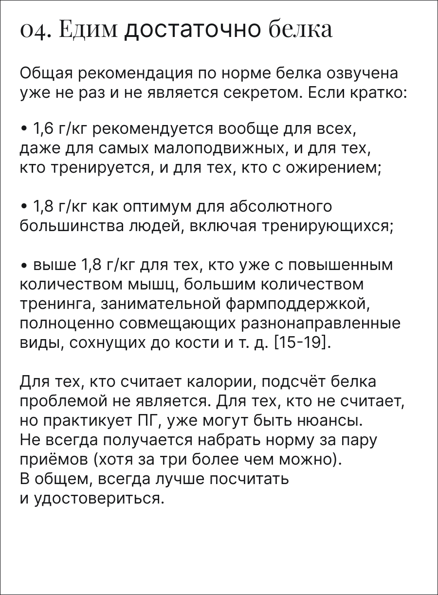 В главе про питание, например, разбираемся, почему важно есть достаточно белка, как узнать свою норму, и какими продуктами её набрать.